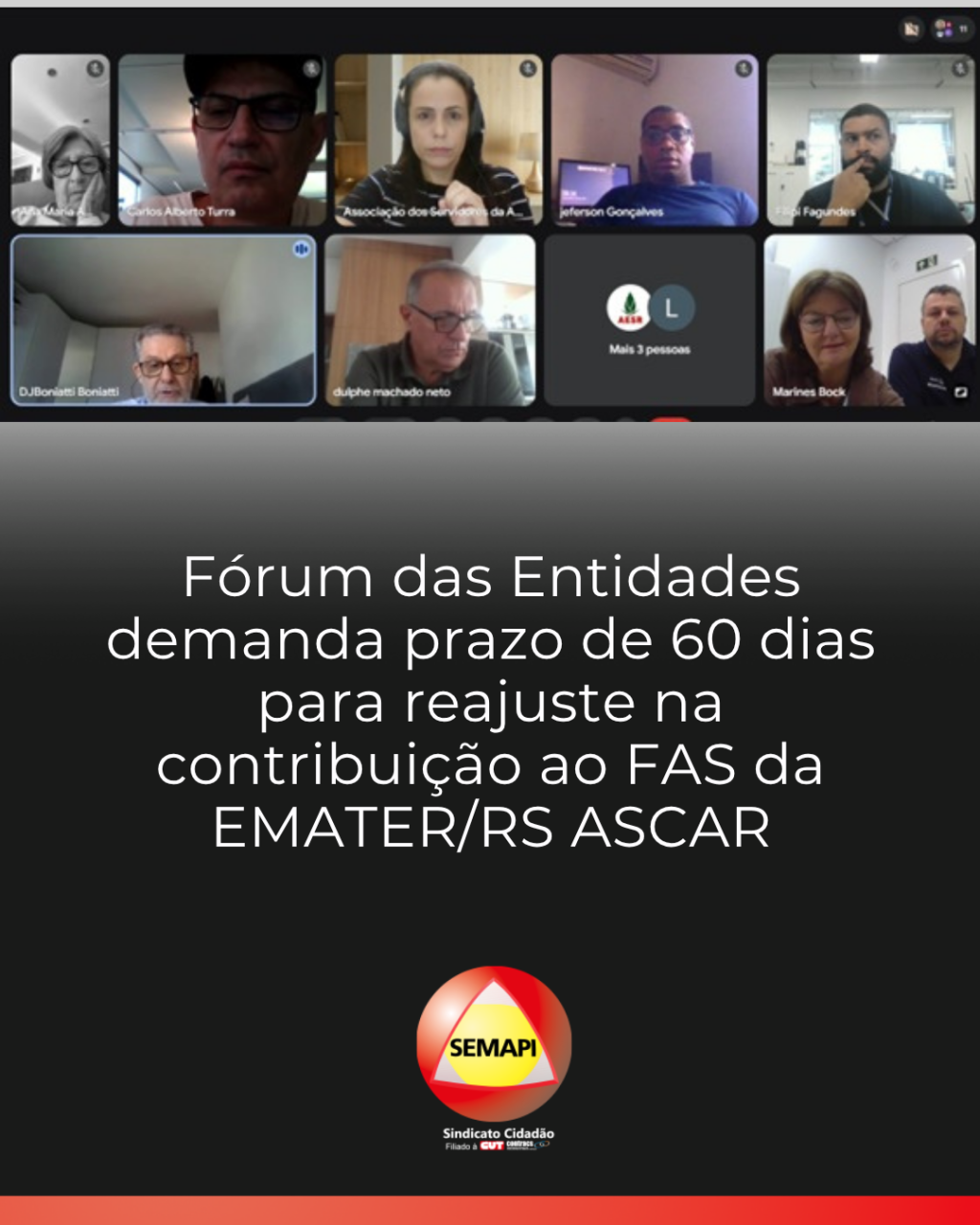 Reunidos de forma virtual na manhã desta sexta-feira (10), representantes das entidades que compõem o Fórum das Entidades Representativas de trabalhadores e trabalhadoras da EMATER/RS ASCAR, integrado pelo SEMAPI, debateram a proposta apresentada pela direção da Instituição referente ao Fundo de Assistência à Saúde (FAS). O principal ponto de preocupação é a intenção da empresa de aplicar já na próxima folha de pagamento o reajuste de 35% na contrapartida de colegas ativos e aposentados.