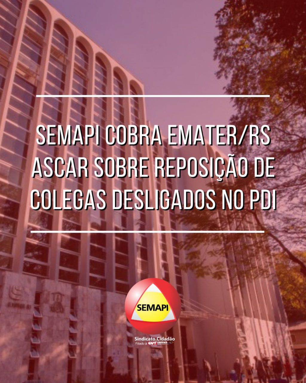 Na última semana, o SEMAPI oficiou a gestão da EMATER/RS ASCAR sobre a saída de colegas via Programa de Desligamento Incentivado (PDI). No texto, o Sindicato cobra informações sobre reposição das vagas.