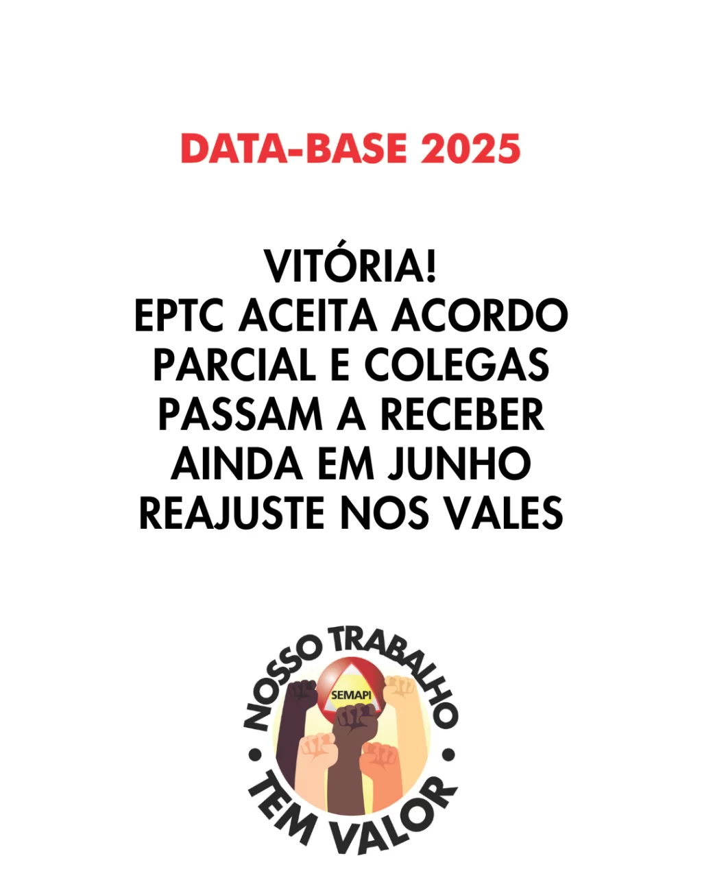 Nesta sexta (6), colegas da EPTC foram informados sobre o início do pagamento do reajuste nos vales, dentro da data-base 2025. A medida faz parte da proposta aprovada parcialmente pela categoria em Assembleia Geral – e resultado direto da articulação do SEMAPI.